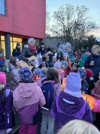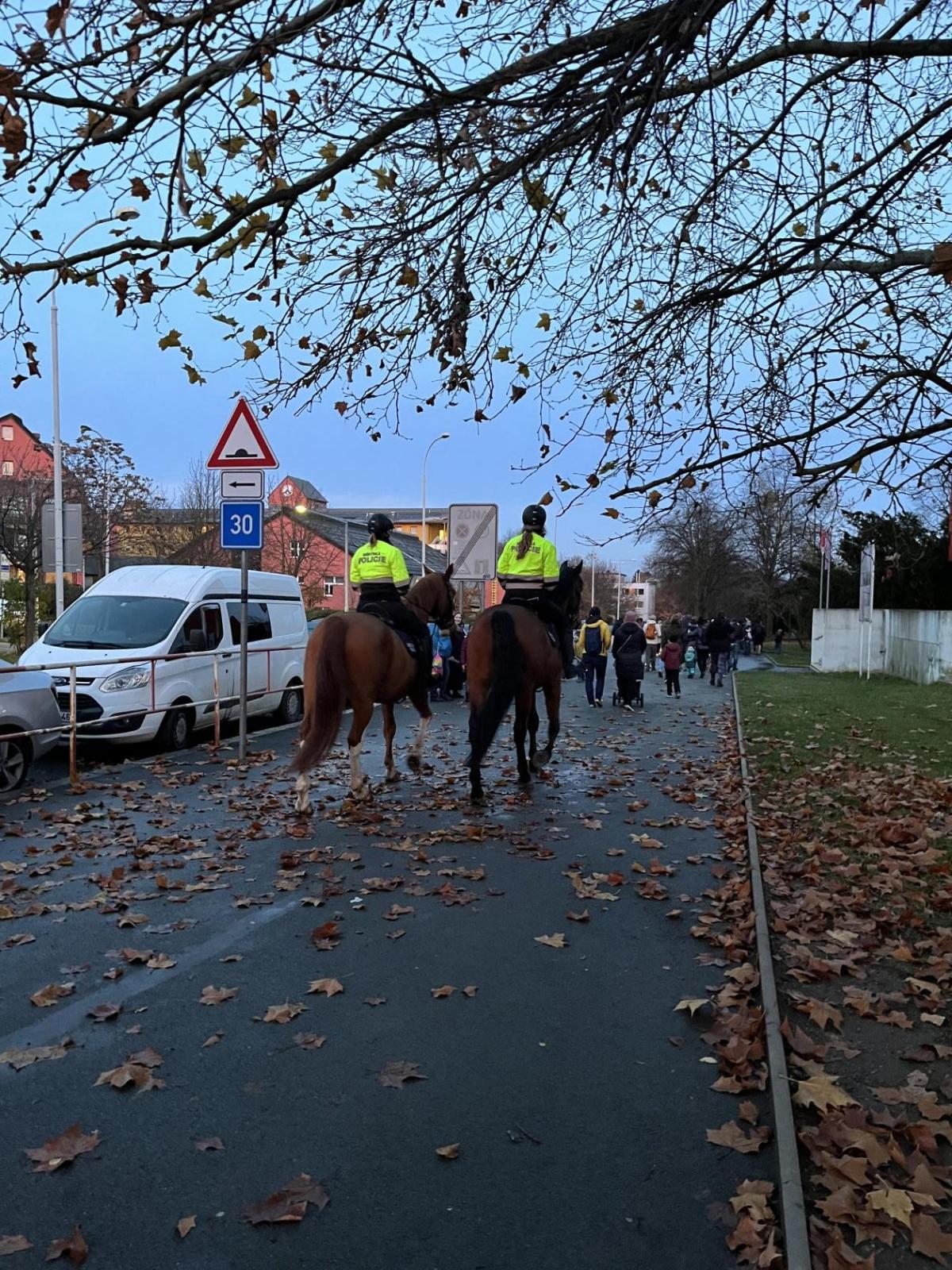 A nakonec dorazil i Svatý Martin na bílém koni… tedy skoro – přijely k nám městské policistky na hnědých koních a společně jsme vyrazili do lampionového průvodu, který krásně zakončil celý den.