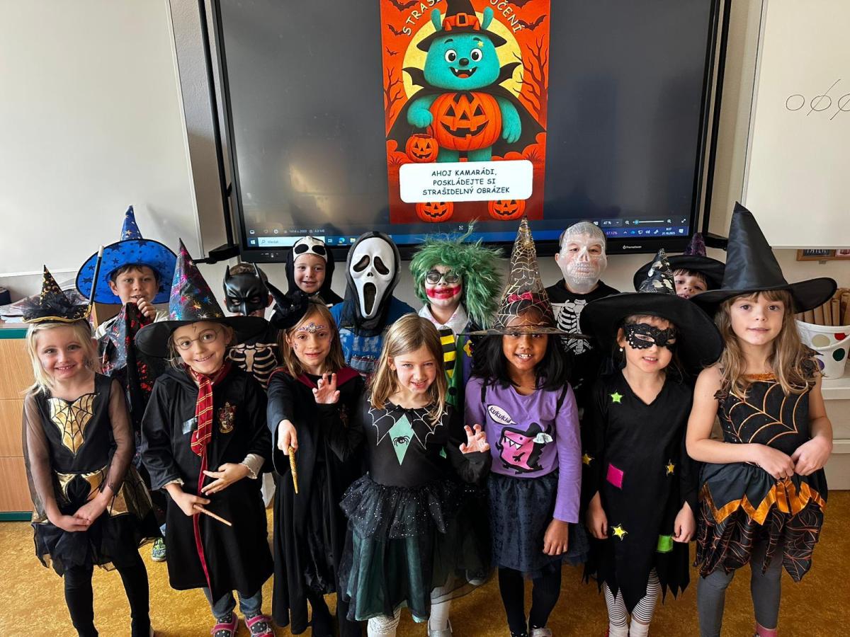 Ve čvrtek se naše první třídy proměnily ve svět plný kouzel, strašidel a smíchu. Děti přišly do školy v krásných i strašidelných maskách – nechyběli čarodějové, duchové, kostlivci ani postavy ze strašidelných filmů.