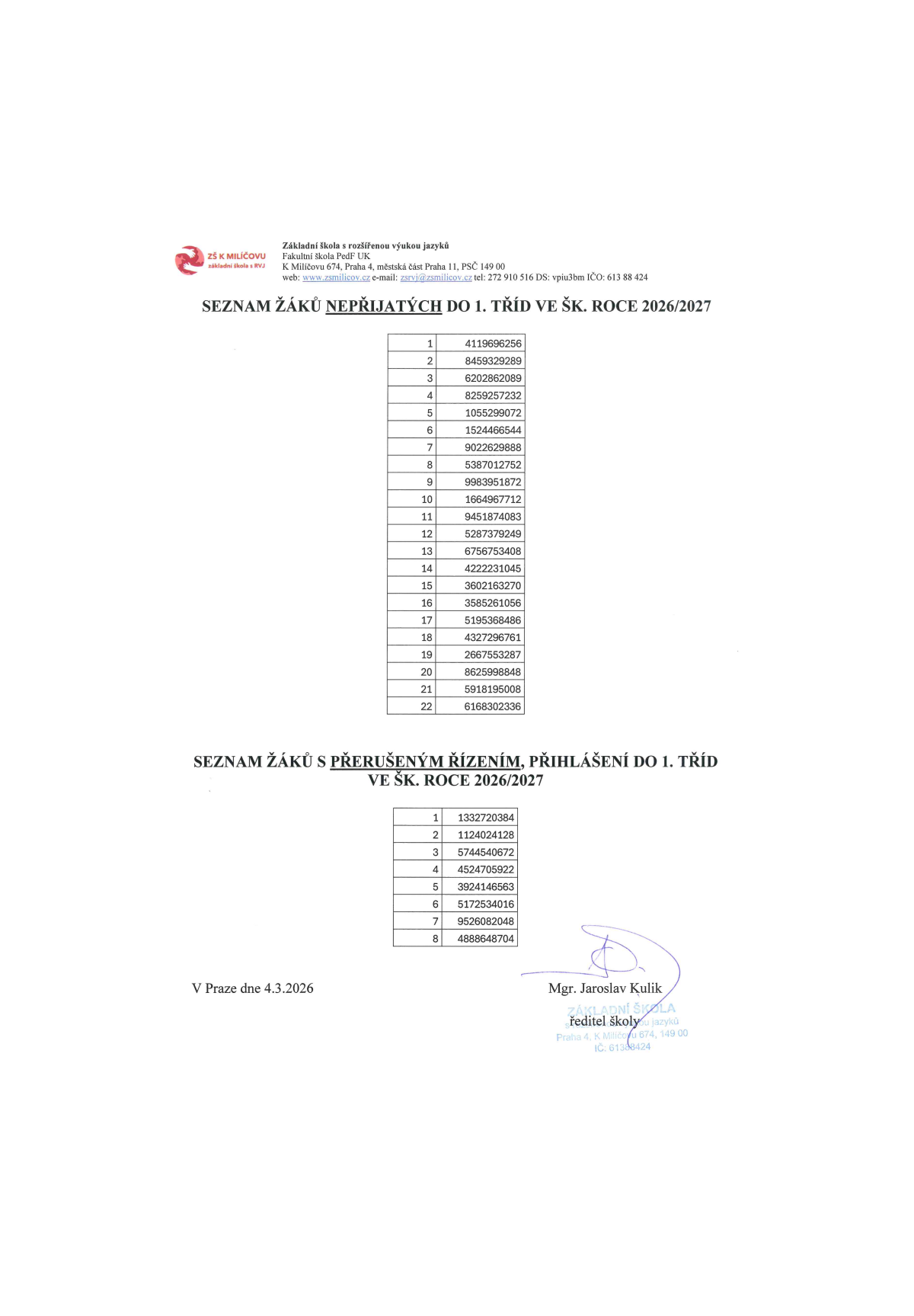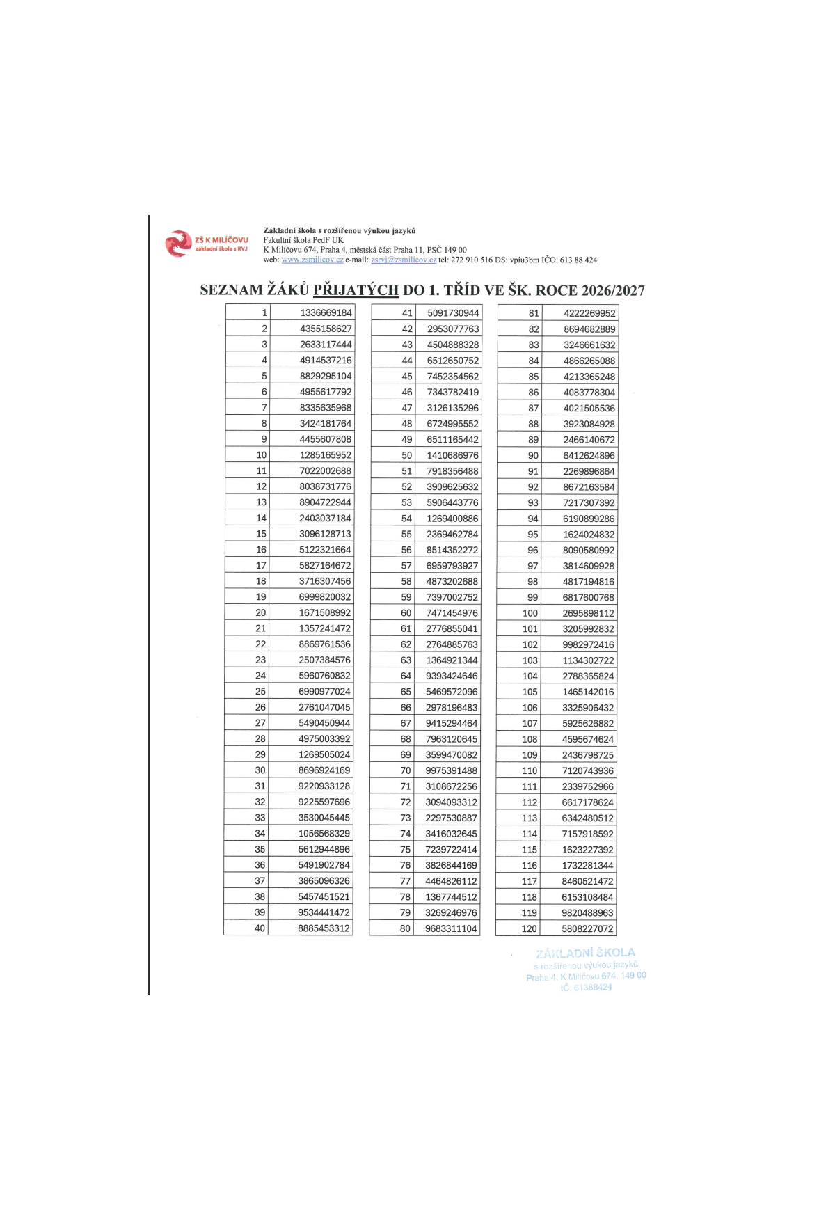 Seznam přijatých žáků do budoucích 1. tříd