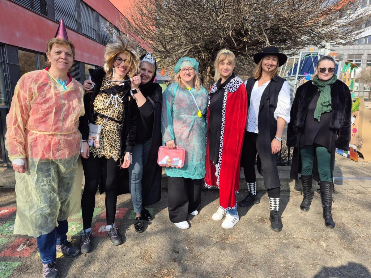 Školní karneval, původně plánovaný uvnitř, se díky krásnému počasí přesunul ven.