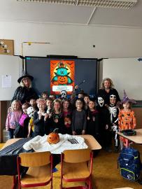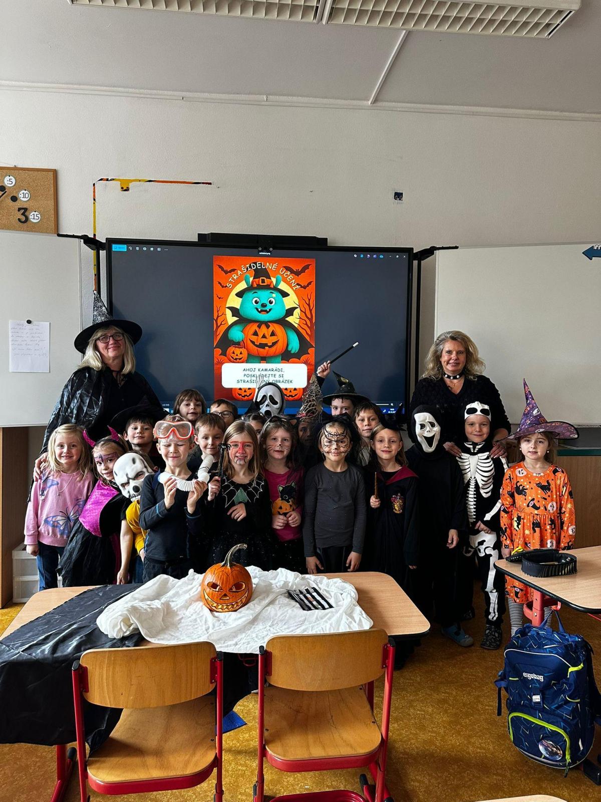 Ve čvrtek se naše první třídy proměnily ve svět plný kouzel, strašidel a smíchu. Děti přišly do školy v krásných i strašidelných maskách – nechyběli čarodějové, duchové, kostlivci ani postavy ze strašidelných filmů.