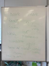 Děti obrázky popisovaly, sdílely své postřehy a nápady, co je při pohledu na ně napadá. Jejich odpovědi jsme zapisovali na tabuli. Společně jsme tak vytvořili první představu o tématu.
