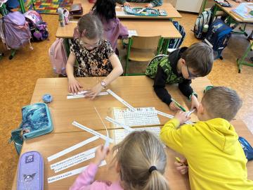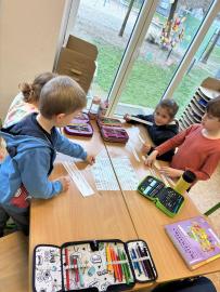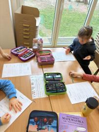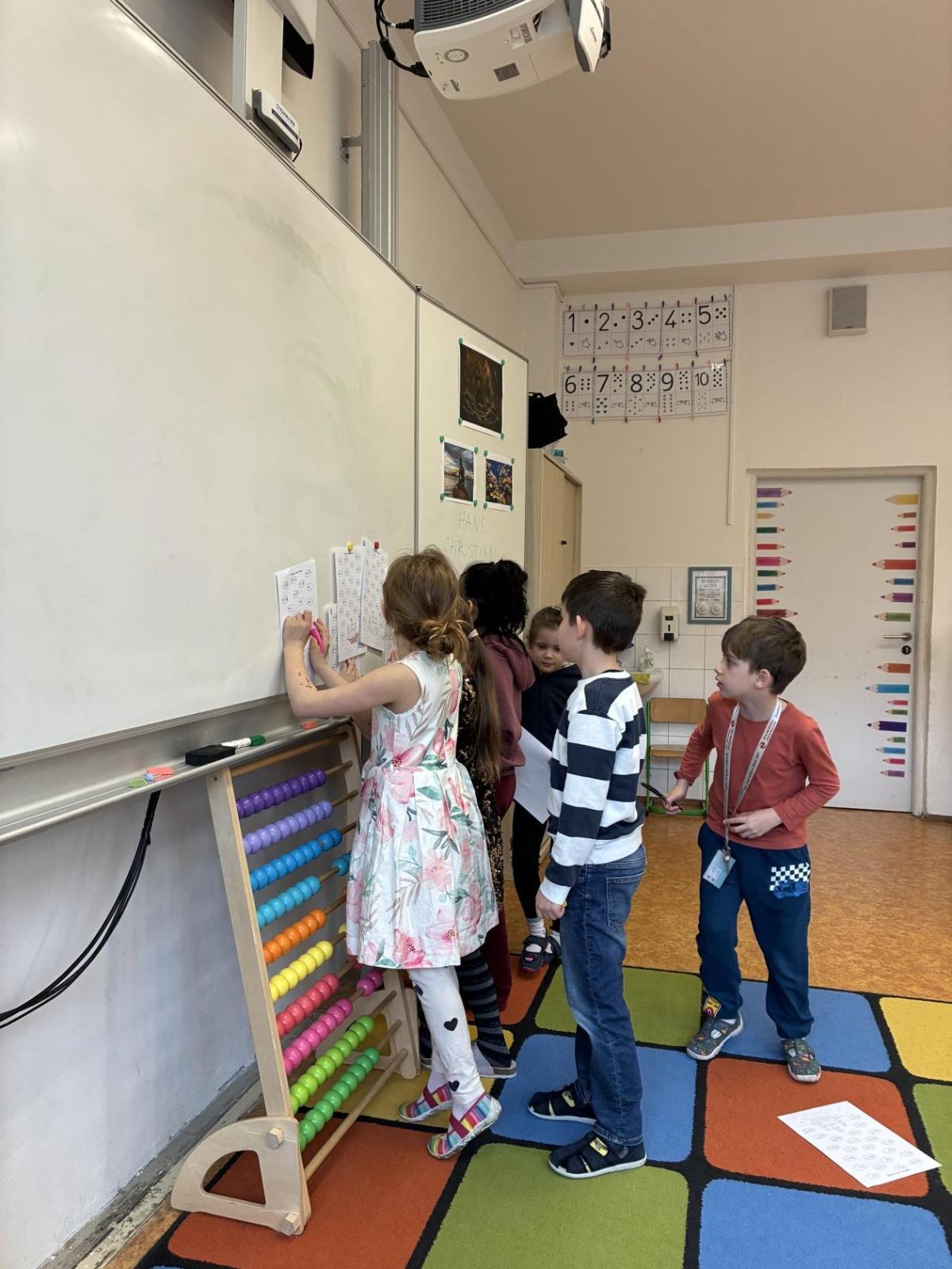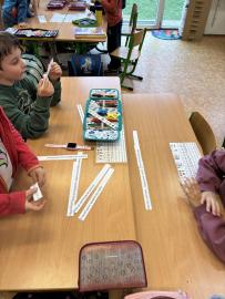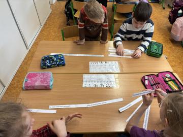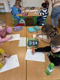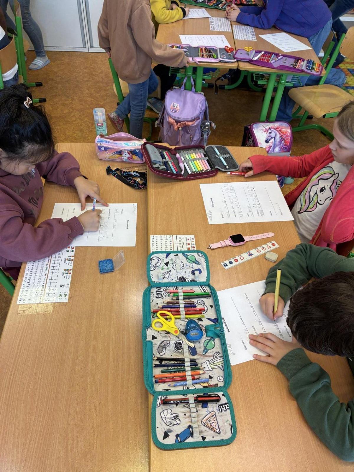 Po přestávce jsme pracovali s obrázkovými příklady u motivu plachetnice. Každá chyba znamenala „zásah dělem“ do lodi, což děti motivovalo k pečlivému počítání. Většina měla příklady správně, nikdo neudělal více než tři chyby. Děti si výpočty samy zkontrolovaly podle vzoru, opravily chyby a nakonec si vybarvily obrázek plachetnice. V dalším početním úkolu si žáci zahráli na špiony a potichu hledali na pracovním listě správný počet indicií. Kluci byli piráti a děvčata malé mořské víly.