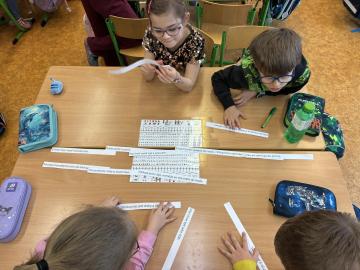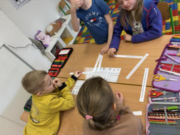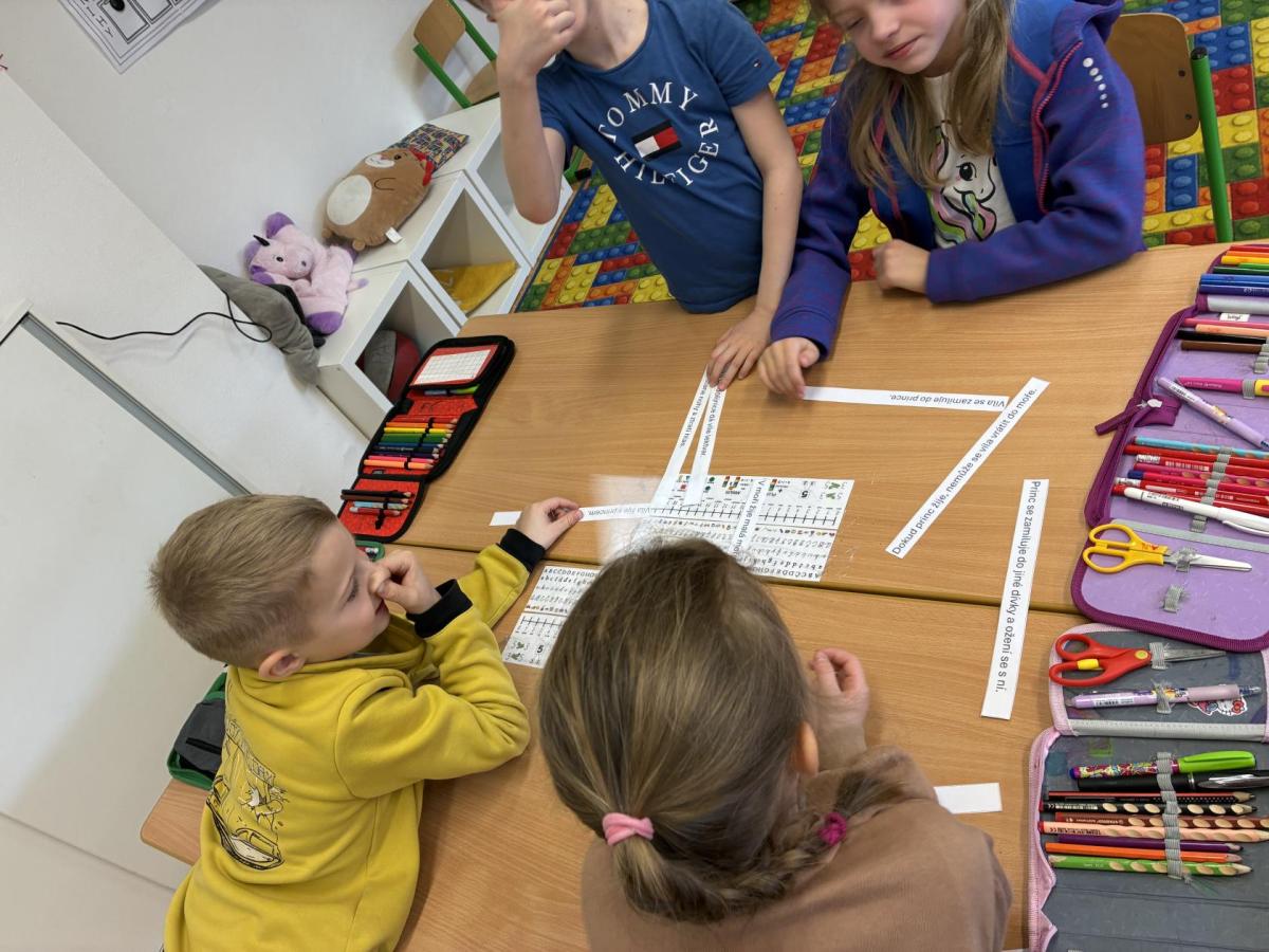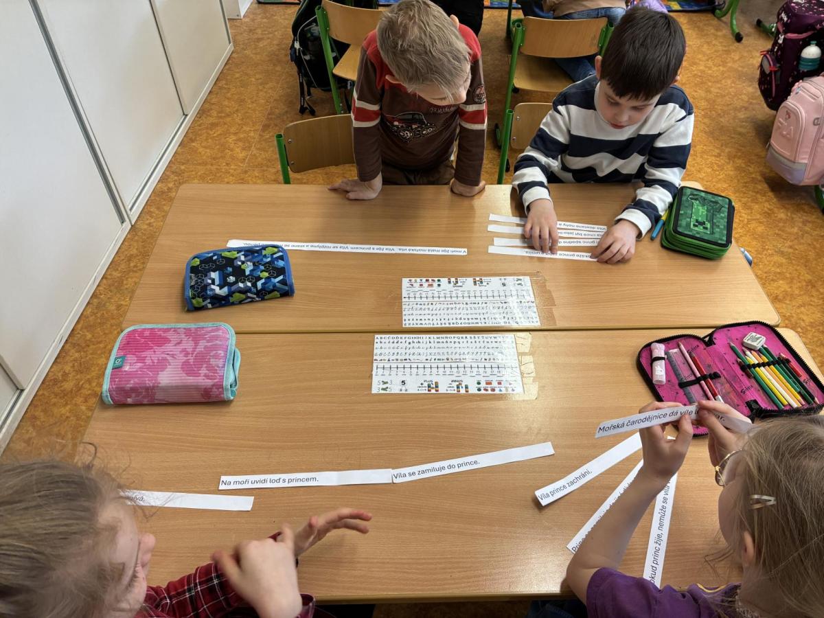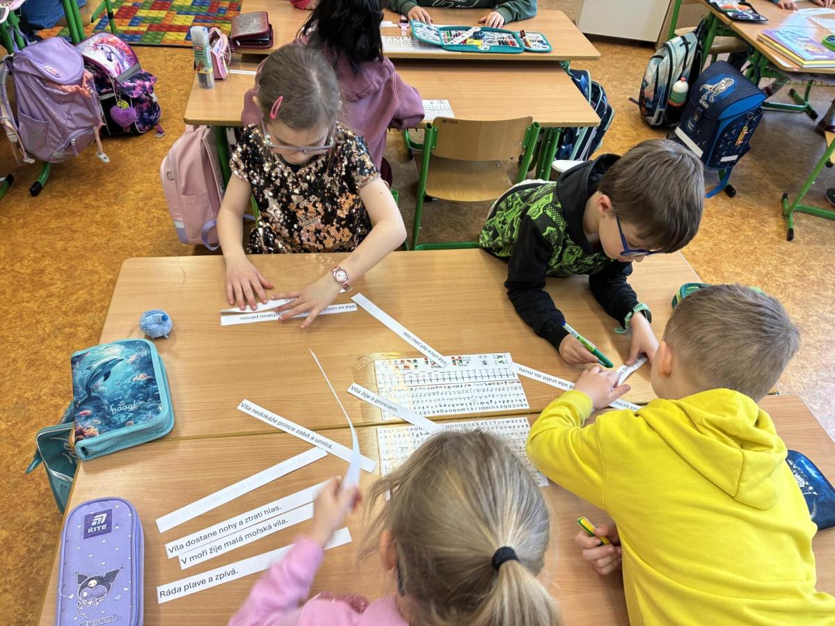 V další hodině děti pracovaly s rozstříhaným textem pohádky o malé mořské víle. V týmech si přečetly jednotlivé věty a skládaly je do správného pořadí podle děje. Hotový příběh jsme si společně přečetli a znovu si tak připomněli jeho celkovou strukturu. Děti si také vybarvovaly omalovánky s motivem této pohádky.