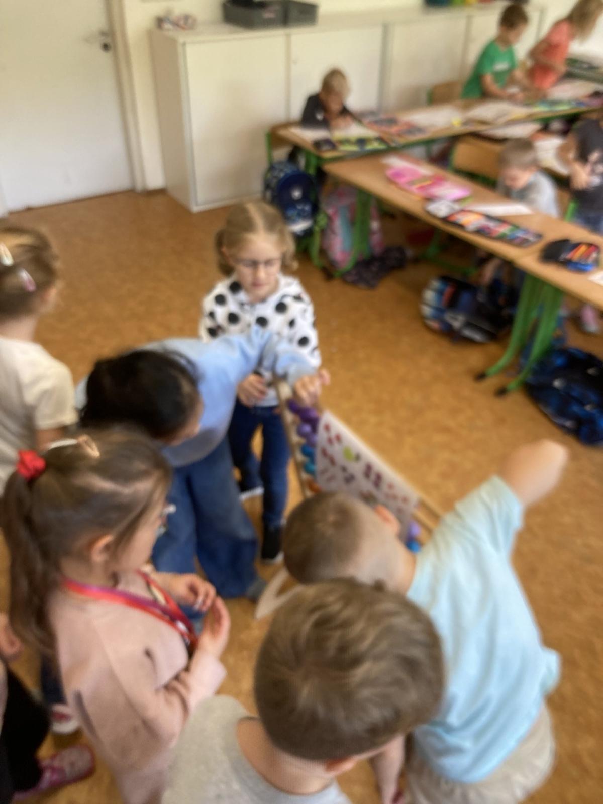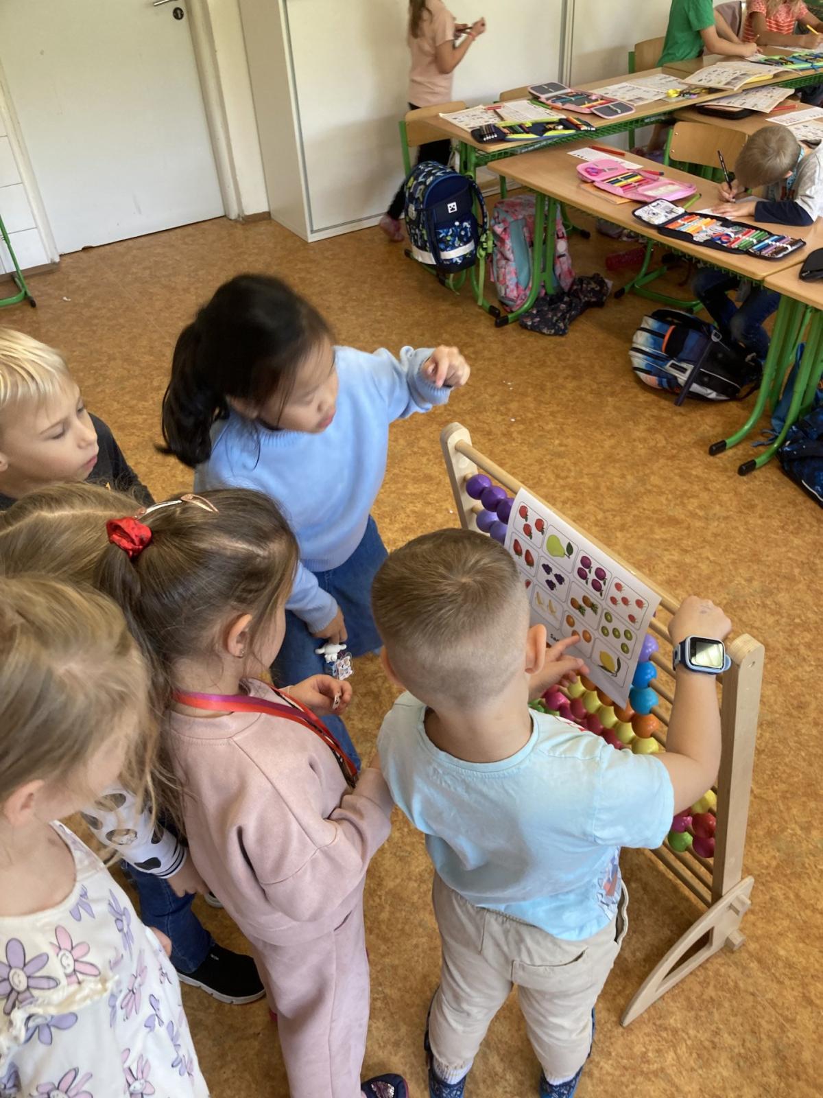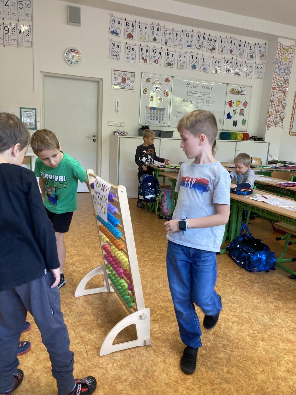 Každý dostal záznamový arch, zezadu na počítadle byl nalepený list s obrázkovým počítáním. Žáci pak chodili k listu s obrázky a snažili se zapamatovat si, kolik je na obrázku např. hrušek, jablek a dalších věcí. Pak se vraceli do lavice a zapisovali své výpočty do záznamového archu. Při jedné cestě k listu s obrázky a zpět do lavice mohli zaznamenat pouze jeden počet. Trénovali jsme tím soustředěnost, paměť, zrakové rozlišování, orientaci v prostoru a počítání do 5. Ve třídě bylo ticho, že by šlo slyšet spadnout špendlík - protože, pokud by si děti spolu povídaly nebo se jinak rušily, zapomněli by cestou co spočítaly. A nikomu se nechtělo zbytečně vracet...