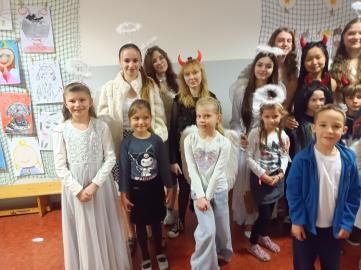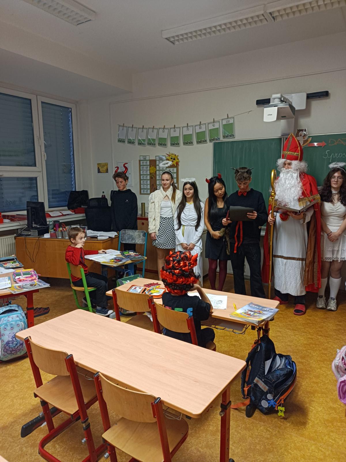 5. prosince navštívil naši školu Mikuláš. Samozřejmě nepřišel sám. Nechyběli andělé ani čerti. Ti přinesli pekelnou listinu od samotného vládce pekel - Lucifera. Byla na ní napsaná jména těch, kteří se ve škole úplně nechovají podle pravidel. Ti také dostali od Mikuláše bramboru. Ostatní jsme dostali adventní kalendář, aby nám čekání na Ježíška sladce utíkalo. Naše hříšníky zachránila paní učitelka. Protože se do konce vyučování chovali pěkně a slíbili, že se budou snažit o zlepšení, budeme do Vánoc mlsat všichni. :)
