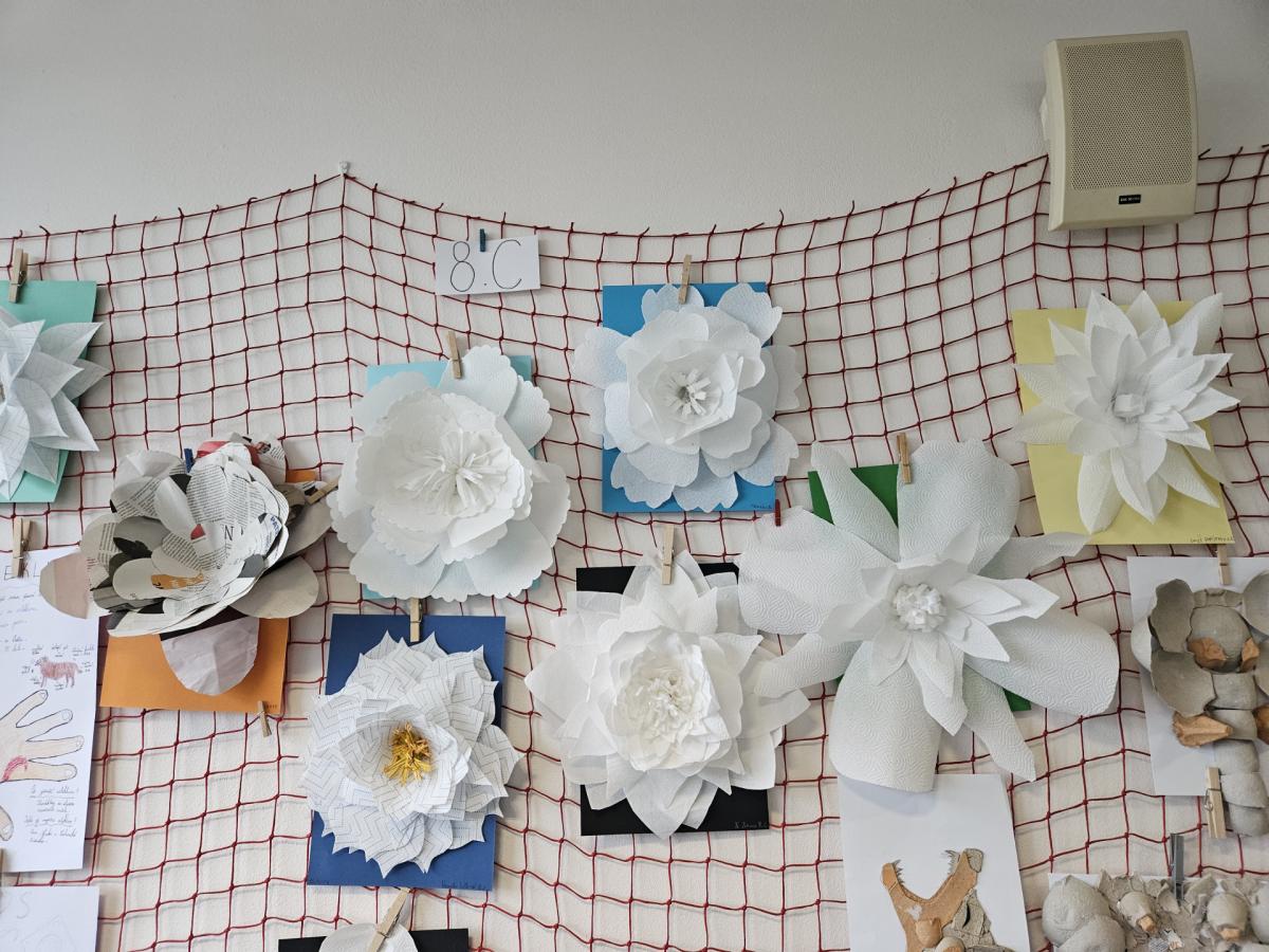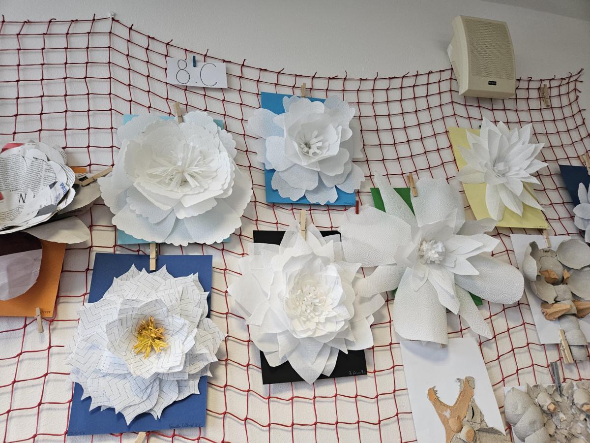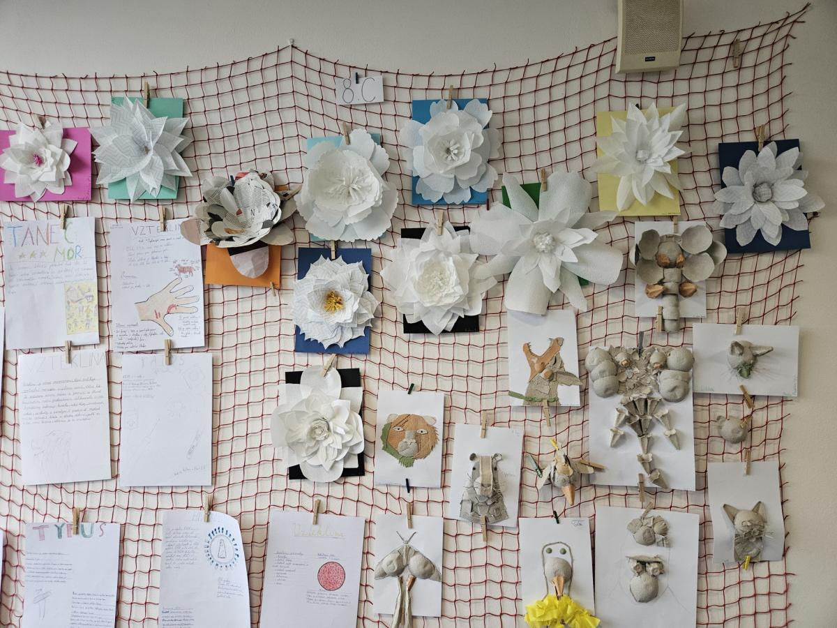 Práce s prostorovou tvorbou, téma recyklace a papírový květ.
